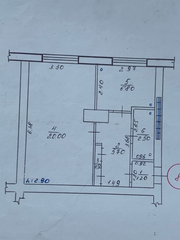 Жилая площадь составляет комфортные 20 квадратных метров, а кухня занимает 6.8 квадратных метров, предоставляя достаточно места для приготовления и приёма пищи. Санузел в квартире совмещённый, что является удобным решением для небольшого пространства.