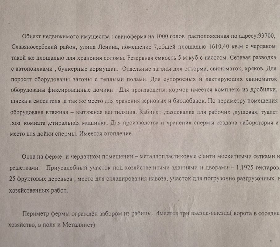 Объект недвижимого имущества . свиноферма на 1000 голов расположенная по адресу:93700 Славяносербский район, улица Ленина, помещение 7,общей площадью 1610,40 кв.м с чердаком такой же площадью для хранения соломы, Резервная ёмкость 5 м.куб с насосом. Сетевая разводка с автопоилками , бункерные кормушки, Отдельные загоны для откорма, свиноматок, хряков. Для поросят оборудованы загоны с теплыми полами. Для супоросных- и лактирующих свиноматок оборудованы фиксированные домики . Для производства кормов имеется комплекс из дробилки, шнека и смесителя ,а так же место для хранения зерновых и биодобавок, По периметру помещения оборудована вытяжная вентиляция. Кабинет раздевалка для рабочих ,душевая, туалет втяжная .хоз. комната ,стиральная машинка, Для производства и хранения спермы создана лаборатория место для дойки спермы. Имеется отопление