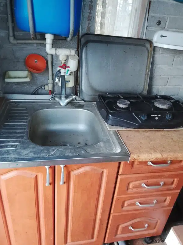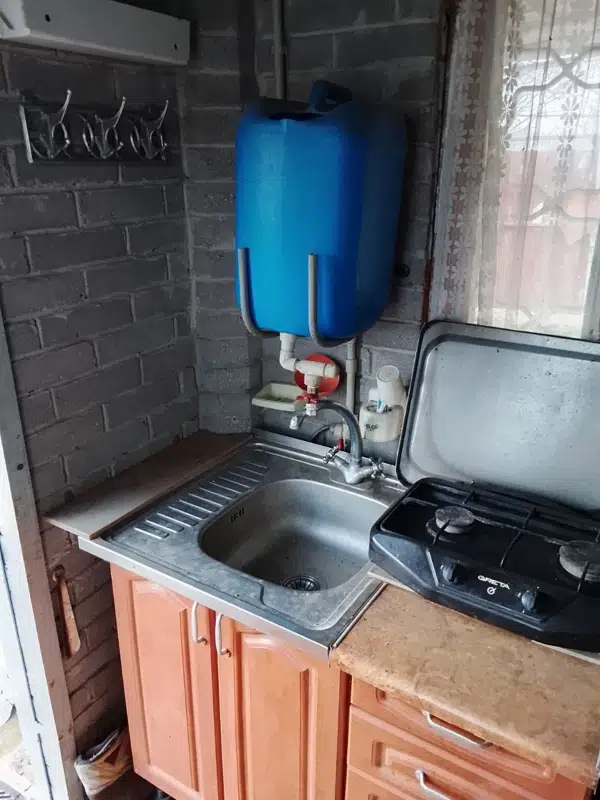 Тамбур оборудован мини-кухней с газовым балоном и умывальником. Поливная вода заведена в дом к умывальнику. Рядом по улице колонка с питьевой водой.