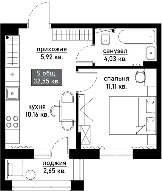 Лоджия — 5,8 м (застеклена), балкон — 3,5 м