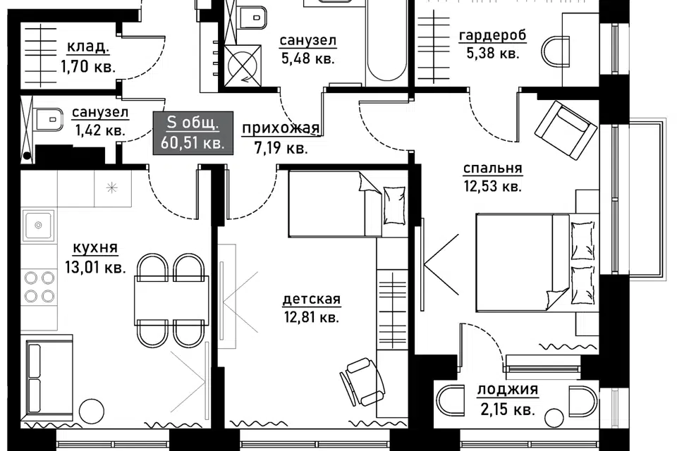 Отличие планировки - совмещенный зал и кухня, 2-е изолированные спальни.
