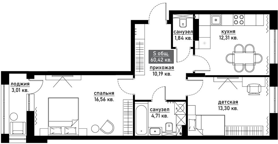 Общая площадь: 44.2 м2