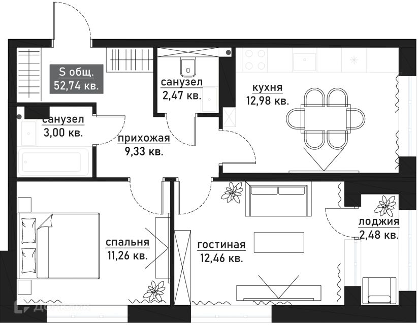 • Общая площадь: 52,6 м²