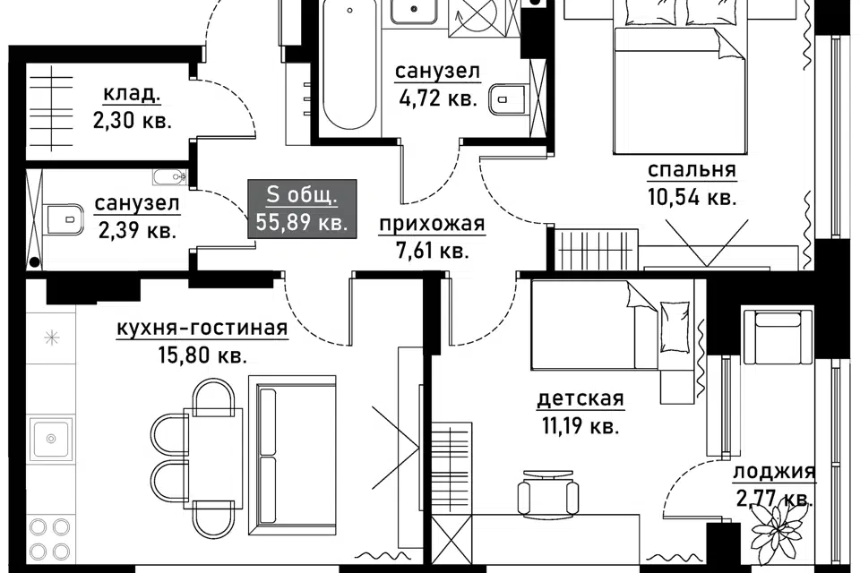 Общая площадь 55.4 кв. м., кухня 7.4 кв. м., этаж 9/9
