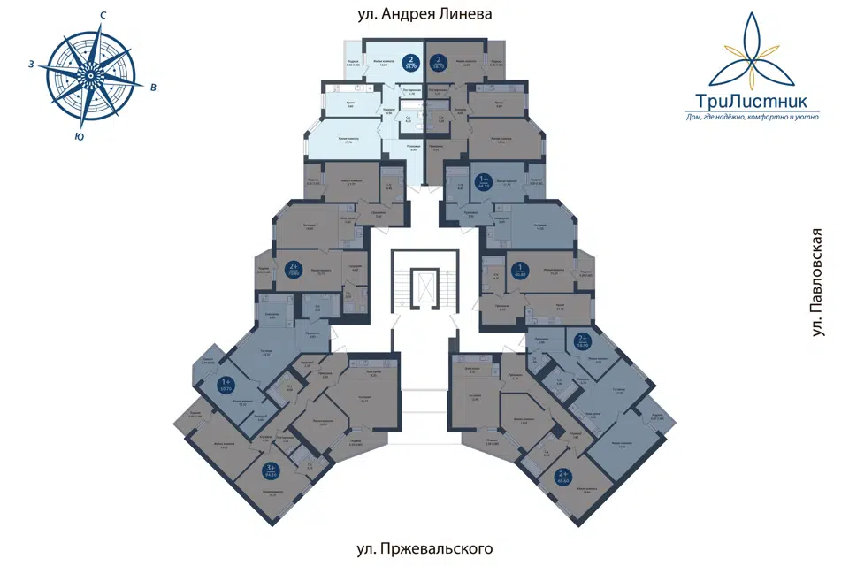 | 🟢 Площадь | от 43 до 57 м2. |