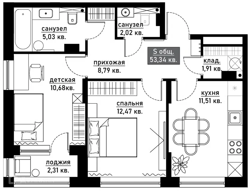 oбщей плoщадью 55,4 м²