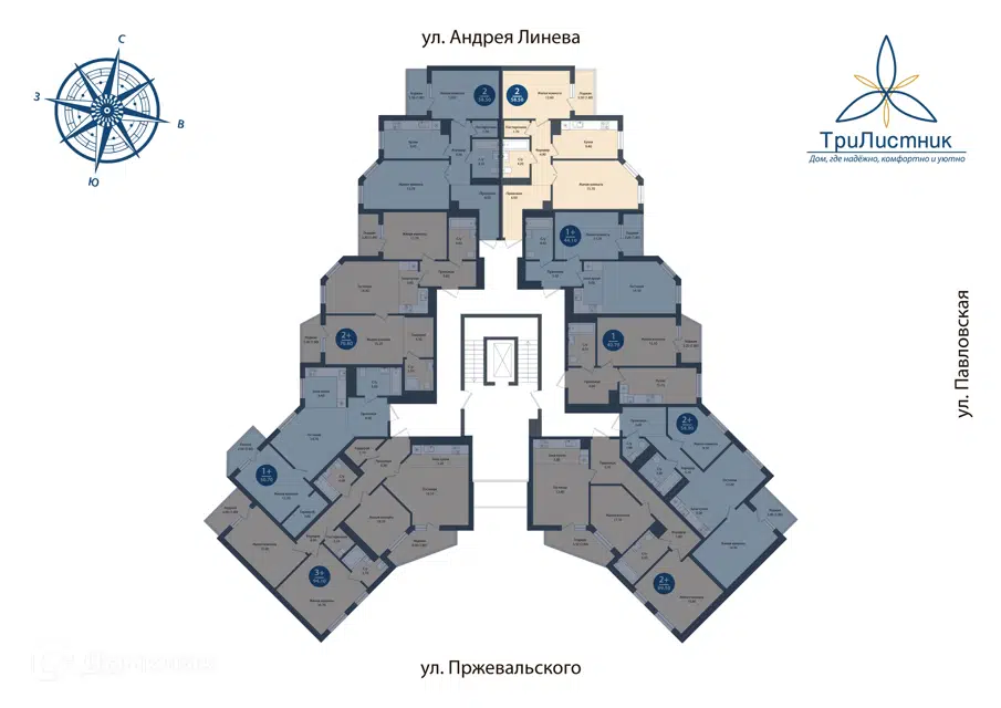 Расположена на 2 этаже 9-этажного дома. Общая площадь - 72,8 м²