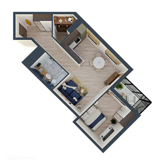Отличие планировки - совмещенный зал и кухня, 2-е изолированные спальни.