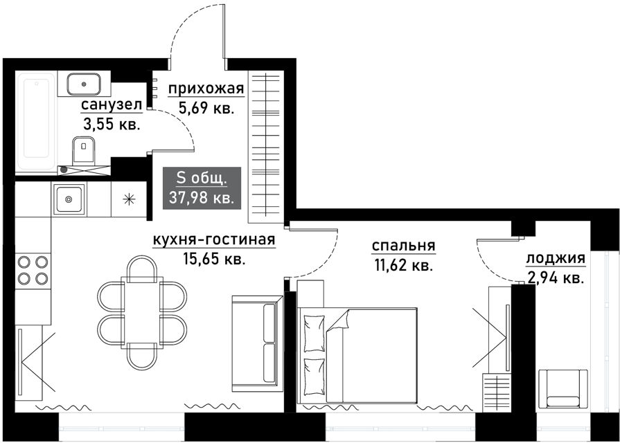 Площадь: 33м² (жилая ~18 м², кухня 7,2 м²)