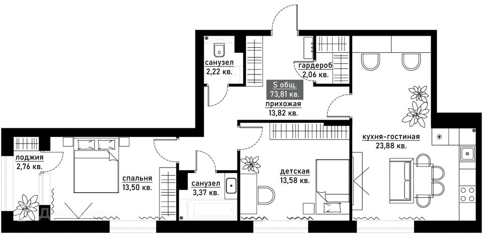 Площадь 74 кв.м, 4/9 этаж.