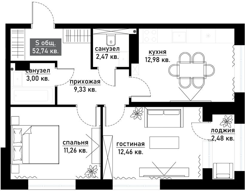 🏡 Общая площадь: 47,6 кв. м. Жилая площадь: 32,6 кв. м. Площадь кухни: 5,3 кв. м