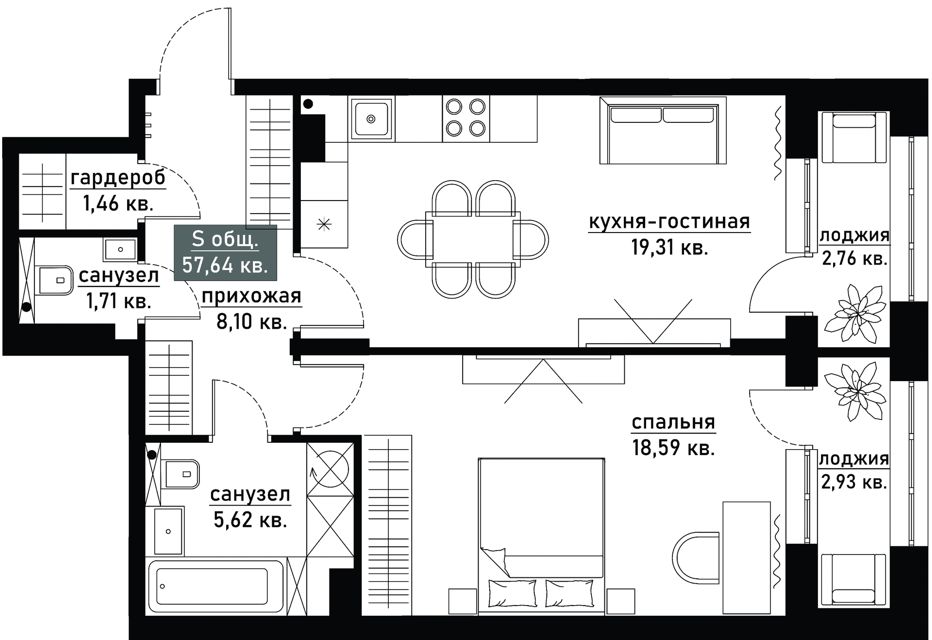 - Общая площадь: 60,80 м²