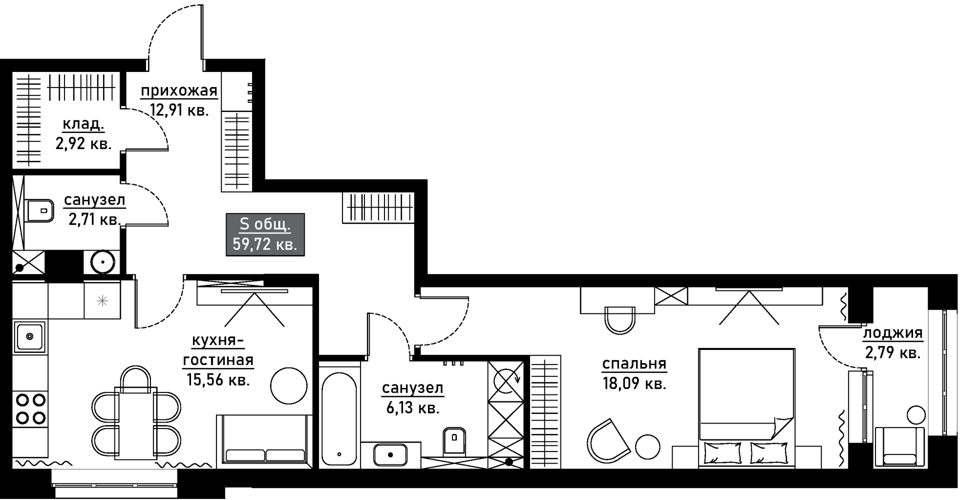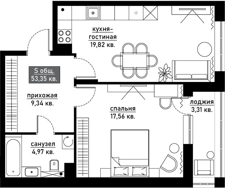 Общая площадь: 55 м2