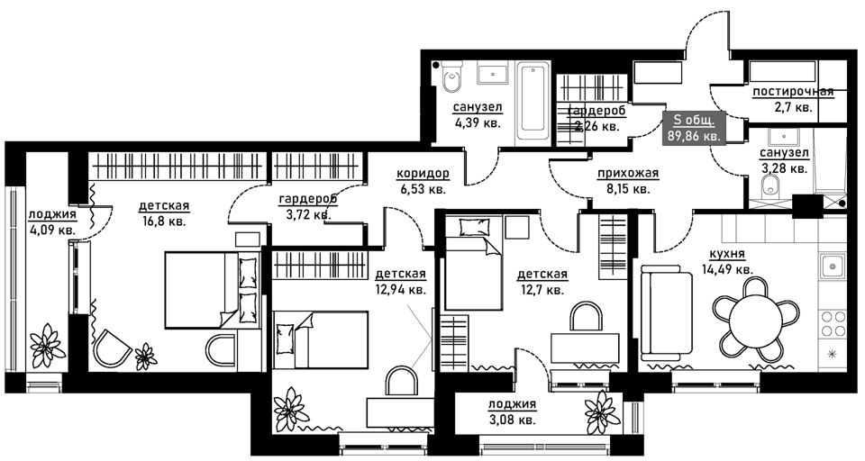 • Площадь: 90 кв.м. (4 просторные комнаты)